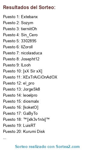 Lista de participantes: тѕυи, ranklaking, greenplay, F3CH3, Lbibbins, HuguiitO, jose miguel, LvisMessi, wolaman, diosmalx, [Ginkaku], AniiJesus, Dark_Fatal, nicolasduca, tierniitOh, .Scorpion, Sin_Cero, OofullrakionoO, leoelpro, TenShi[Ro]X, Sozym, Fire!, ThePeRRaZo, [xX Sir xX], Josepht12, Bob Marley, Dash©, edua147, The-Last-Chinchanpu, [gunzhg], zapfire, NoOTiBoy, Notrexx, ™[xlk3v1nlx]™, jeanpool[xD], omaster, Kurumi Disk, John Kramer, GzusMataa, [Pollito], мя ¢яα¢кє∂, DaggerStation, theinmortal, MaxAburrimiento, [CaoS]PierO^, GagaVicious, L0Kvr4xD, TheduelX, XExTrAiCiOnAdOX, [The_Dark_Fox], >fernhan2<, Josdavi, #Cookiee, Wilord[XD], GaByTo, LuisRT, lLooh, JorgeSk8, arone, Extebanx, gregory2170, el_pro, [koketO], llZoroll, elpran33, iGreek!, 3302895, ¤Gaara¤, Marco[xD].