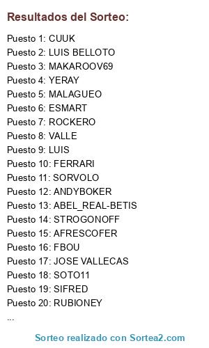 Lista de participantes: MAKAROOV69, ANDYBOKER, RUBIONEY, ESMART, VALLE, CUUK, LUIS BELLOTO, LUIS, MALAGUEO, CHRISTIAN, FBOU, SORVOLO, ROCKERO, ABEL_REAL-BETIS, SOTO11, JOSE VALLECAS, FERRARI, AFRESCOFER, AKTGANO, YERAY, STROGONOFF, SIFRED.