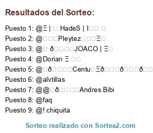 Lista de participantes: @Ismael 👑, @▸🐊┊Ozuˢªᵈ, @▸ 💼┊LautiZ Abogau | Ξ✪ ༒👑, @▸🏀┊bob__is 💸, @Daxter, @▸🏀┊𝓟3𝓻𝓧𝓱0 ˢᵏʸ ᵒᶠ ᴸᶦᵒⁿˢ, @▸🏀┊MichiBros de Lauti ¡ Ξ | ✪, @▸🏀┊ZukulemtoY Ξ✪🦁🎯, @lleguetardeayer, @Jesus 🚦, @Quesito🧀⚔༒, @L y B, @▸🏀┊Charmingᴺᵒᵛⁱᶜⁱᵒ 👑, @Luis Angel, @DonDiablo | Ξ𝗟𝗜𝗧𝗘 ✪, @▸🐾┊🇮🇹 ITALI BOY ༒👑Ξ𝗟𝗜𝗧𝗘 ✪, @!agustin 🔱, @Adan, @JonyREY 🔱, @▸🔧┊SoyArty ᵈᵘᵉⁿ̃ᵃ ᵈᵉ ᵉˡᵐᶦᶜʰᶦ, @𝘿𝙀𝘼𝘿𝙋𝙊𝙊𝙇, @▸ 🎲┊⛓Edura Ξ𝗟𝗜𝗧𝗘 ✪, @Franco, @▸👼🏽┊Murcianico👑ᴰᵉ ᶜᵃˡᵛᵒ, @Pumita IQ, @José lili👑ᴰᵉ ᵐᵘʳᶜⁱᵃⁿⁱᶜᵒ, @▸👑┊Loiro🎯, @Yatto Ξ✪, @.Lena ᵈᵉ ᴮˡᵃᶜᵏᶠˡᵃᵍ ᵘʷᵘ 🔱, @▸🐀┊DonJovi 👑, @▸┊Videlita, @🇪🇨;《Pana Arabe 2.0》, @▸🏀┊Centu┊Ξ𝗟𝗜𝗧𝗘 ✪, @⚡Marccelion༼⦇𝓋𝓮𝓷𝓭𝓮𝓽𝓽𝓪⦈༽, @WM mazana amarilla🎯รкץ ๏Ŧ ɭเ๏ภร, @. ▸🏀┊ARROW🎯, @#SaMBlaKs👑ᵈᵉ ᵗᵒᶜᵃᵍᵃᶦᵗᵃ, @▸ 👑┊JOACO | Ξ✪, @faq, @Alex 18 ℂ𝔻𝕄 💸, @▸🐣┊Matyu🔱💸, @@▸🏀┊Andres Bibi, @⚡ JP Ξ✪, @Ragnar ᴴᵃᶜᵏᵉʳ 👑, @Tinky🌻⚔, @maxicena, @Chori 👑💸, @▸🏀┊B L O O D Y| Ξ𝗟𝗜𝗧𝗘 ✪, @Ming el barbero, @Smash, @.▸💸┊ Bytyttan👑⚔, @▸👑┊TIBU ༒🎯, @Ξ | ✪ HadeS | Iᴍᴘ ☬, @Dorian Ξ ✪⚔, @Fabri con dedo quebrado Ξ✪, @! chiquita, @▸┊Blaren Ξ✪ᴴᵃᶜᵏᵉʳ, @Kirito, @👑|CustoMech, @Sonika Ξ𝗟𝗜𝗧𝗘 ✪, @Nax┆⚔┆Ξ✪, @▸🕵🏻♂┊Maki Shijo(Happy)👑, @𝐕𝐢𝐫𝐮𝐦𝐚𝐧𝐜𝐢𝐚 I 𝕷𝖎𝖔𝖓 ⚔, @▸👑┊𝔼𝕝𝕁𝕠𝕣𝕕𝕒𝕤, @;Neos 🔱 ᵈᵉ ᴹʸˢᵗⁱᶜ, @𝔻𝕒𝕧𝕚𝕕 ☠, @Vergeta, @▸✪┊PleytezˢᵏʸΞ✪, @▸🏀┊Sumi, @Haru, @t0bias, @Mapachito 🦝, @▸🏀┊RoJaMs ⚡🐍, @▸🏀┊Polo ᵈᵉ ʸᵒˢʰᶦ, @Pablo69, @G a w ☬, @DreeWant, @;Mystic 🔱 ᵈᵉ ᴺᵉᵒˢ, @Kaku, @alvtillas, @▸🐶┊Clooxz Ξ✪.