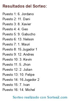 Lista de participantes: 1. Mauri, 2. Julian, 3. Kevin, 4. Geo, 5. Jhon, 6. Jordano, 7. Ivan, 8. Xavier, 9. Gabucho, 10. Felipe, 11. Dani, 12. Andres, 13. Nelson, 14. Michel, 15.Jugador 1, 16.Jugador 2.