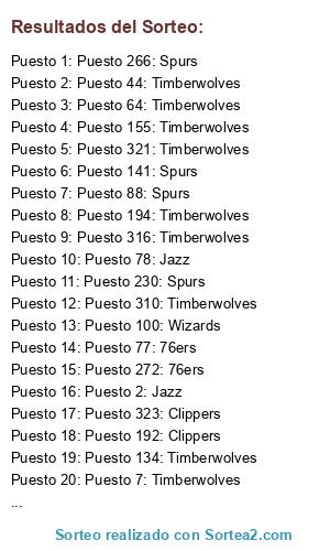 Lista de participantes: Puesto 1: Wizards, Puesto 2: Timberwolves, Puesto 3: Raptors, Puesto 4: Timberwolves, Puesto 5: Timberwolves, Puesto 6: Timberwolves, Puesto 7: Timberwolves, Puesto 8: Raptors, Puesto 9: Timberwolves, Puesto 10: Pelicans, Puesto 11: Wizards, Puesto 12: Timberwolves, Puesto 13: Timberwolves, Puesto 14: Timberwolves, Puesto 15: Timberwolves, Puesto 16: Timberwolves, Puesto 17: Raptors, Puesto 18: Timberwolves, Puesto 19: Raptors, Puesto 20: Timberwolves, Puesto 21: Wizards, Puesto 22: Pelicans, Puesto 23: Spurs, Puesto 24: Timberwolves, Puesto 25: Timberwolves, Puesto 26: Spurs, Puesto 27: Timberwolves, Puesto 28: Timberwolves, Puesto 29: Timberwolves, Puesto 30: Timberwolves, Puesto 31: Wizards, Puesto 32: Timberwolves, Puesto 33: Timberwolves, Puesto 34: Raptors, Puesto 35: Raptors, Puesto 36: Pelicans, Puesto 37: Timberwolves, Puesto 38: Pelicans, Puesto 39: Timberwolves, Puesto 40: Timberwolves, Puesto 41: Spurs, Puesto 42: Wizards, Puesto 43: Wizards, Puesto 44: Wizards, Puesto 45: Raptors, Puesto 46: Wizards, Puesto 47: Timberwolves, Puesto 48: Timberwolves, Puesto 49: Timberwolves, Puesto 50: Timberwolves, Puesto 51: Timberwolves, Puesto 52: Spurs, Puesto 53: Wizards, Puesto 54: Timberwolves, Puesto 55: Timberwolves, Puesto 56: Timberwolves, Puesto 57: Raptors, Puesto 58: Raptors, Puesto 59: Raptors, Puesto 60: Raptors, Puesto 61: Pelicans, Puesto 62: Timberwolves, Puesto 63: Timberwolves, Puesto 64: Timberwolves, Puesto 65: Timberwolves, Puesto 66: Timberwolves, Puesto 67: Pelicans, Puesto 68: Timberwolves, Puesto 69: Pelicans, Puesto 70: Timberwolves, Puesto 71: Timberwolves, Puesto 72: Raptors, Puesto 73: Timberwolves, Puesto 74: Timberwolves, Puesto 75: Raptors, Puesto 76: Timberwolves, Puesto 77: Raptors, Puesto 78: Raptors, Puesto 79: Timberwolves, Puesto 80: Wizards, Puesto 81: Spurs, Puesto 82: Timberwolves, Puesto 83: Timberwolves, Puesto 84: Spurs, Puesto 85: Timberwolves, Puesto 86: Pelicans, Puesto 87: Wizards, Puesto 88: Timberwolves, Puesto 89: Raptors, Puesto 90: Raptors, Puesto 91: Timberwolves, Puesto 92: Timberwolves, Puesto 93: Pelicans, Puesto 94: Timberwolves, Puesto 95: Timberwolves, Puesto 96: Wizards, Puesto 97: Timberwolves, Puesto 98: Timberwolves, Puesto 99: Timberwolves, Puesto 100: Timberwolves, Puesto 101: Wizards, Puesto 102: Pelicans, Puesto 103: Timberwolves, Puesto 104: Timberwolves, Puesto 105: Timberwolves, Puesto 106: Pelicans, Puesto 107: Timberwolves, Puesto 108: Timberwolves, Puesto 109: Spurs, Puesto 110: Timberwolves, Puesto 111: Timberwolves, Puesto 112: Timberwolves, Puesto 113: Timberwolves, Puesto 114: Timberwolves, Puesto 115: Timberwolves, Puesto 116: Spurs, Puesto 117: Timberwolves, Puesto 118: Timberwolves, Puesto 119: Raptors, Puesto 120: Pelicans, Puesto 121: Raptors, Puesto 122: Timberwolves, Puesto 123: Timberwolves, Puesto 124: Timberwolves, Puesto 125: Timberwolves, Puesto 126: Timberwolves, Puesto 127: Pelicans, Puesto 128: Timberwolves, Puesto 129: Timberwolves, Puesto 130: Timberwolves, Puesto 131: Pelicans, Puesto 132: Timberwolves, Puesto 133: Timberwolves, Puesto 134: Timberwolves, Puesto 135: Spurs, Puesto 136: Timberwolves, Puesto 137: Spurs, Puesto 138: Timberwolves, Puesto 139: Pelicans, Puesto 140: Timberwolves, Puesto 141: Wizards, Puesto 142: Timberwolves, Puesto 143: Pelicans, Puesto 144: Timberwolves, Puesto 145: Timberwolves, Puesto 146: Raptors, Puesto 147: Raptors, Puesto 148: Timberwolves, Puesto 149: Timberwolves, Puesto 150: Raptors, Puesto 151: Raptors, Puesto 152: Timberwolves, Puesto 153: Wizards, Puesto 154: Timberwolves, Puesto 155: Timberwolves, Puesto 156: Raptors, Puesto 157: Timberwolves, Puesto 158: Timberwolves, Puesto 159: Timberwolves, Puesto 160: Raptors, Puesto 161: Timberwolves, Puesto 162: Wizards, Puesto 163: Timberwolves, Puesto 164: Pelicans, Puesto 165: Raptors, Puesto 166: Timberwolves, Puesto 167: Spurs, Puesto 168: Timberwolves, Puesto 169: Wizards, Puesto 170: Pelicans, Puesto 171: Timberwolves, Puesto 172: Spurs, Puesto 173: Timberwolves, Puesto 174: Timberwolves, Puesto 175: Spurs, Puesto 176: Wizards, Puesto 177: Raptors, Puesto 178: Pelicans, Puesto 179: Spurs, Puesto 180: Spurs, Puesto 181: Spurs, Puesto 182: Spurs, Puesto 183: Timberwolves, Puesto 184: Timberwolves, Puesto 185: Timberwolves, Puesto 186: Timberwolves, Puesto 187: Timberwolves, Puesto 188: Timberwolves, Puesto 189: Timberwolves, Puesto 190: Raptors, Puesto 191: Timberwolves, Puesto 192: Timberwolves, Puesto 193: Raptors, Puesto 194: Timberwolves, Puesto 195: Timberwolves, Puesto 196: Raptors, Puesto 197: Timberwolves, Puesto 198: Timberwolves, Puesto 199: Raptors, Puesto 200: Timberwolves, Puesto 201: Timberwolves, Puesto 202: Timberwolves, Puesto 203: Timberwolves, Puesto 204: Pelicans, Puesto 205: Spurs, Puesto 206: Spurs, Puesto 207: Timberwolves, Puesto 208: Timberwolves, Puesto 209: Timberwolves, Puesto 210: Wizards, Puesto 211: Raptors, Puesto 212: Timberwolves, Puesto 213: Timberwolves, Puesto 214: Pelicans, Puesto 215: Timberwolves, Puesto 216: Timberwolves, Puesto 217: Pelicans, Puesto 218: Timberwolves, Puesto 219: Raptors, Puesto 220: Raptors, Puesto 221: Timberwolves, Puesto 222: Timberwolves, Puesto 223: Raptors, Puesto 224: Timberwolves, Puesto 225: Spurs, Puesto 226: Pelicans, Puesto 227: Pelicans, Puesto 228: Pelicans, Puesto 229: Timberwolves, Puesto 230: Spurs, Puesto 231: Timberwolves, Puesto 232: Timberwolves, Puesto 233: Timberwolves, Puesto 234: Timberwolves, Puesto 235: Spurs, Puesto 236: Timberwolves, Puesto 237: Timberwolves, Puesto 238: Timberwolves, Puesto 239: Timberwolves.