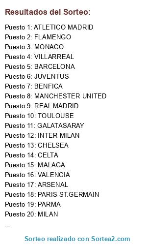 Lista de participantes: CHELSEA, BARCELONA, FLAMENGO, REAL MADRID, PARIS ST.GERMAIN, VALENCIA, JUVENTUS, MALAGA, BENFICA, SHAKTAR DONETSK, CHIEVO VERONA, MANCHESTER UNITED, CELTA, INTER MILAN, GALATASARAY, TOULOUSE, VILLARREAL, ATLETICO MADRID, ARSENAL, MILAN, PARMA, MONACO.