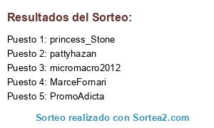 Lista de participantes: costadeorouy, micromacro2012, SzafranCom, FranOreok, princess_Stone, corpcommunis, LorenaBagnasco, MarceFornari, PromoAdicta, magaaace, BekermanDafne, letyzetabe, pattyhazan.
