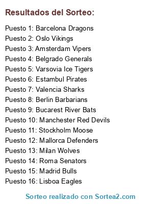 Lista de participantes: Valencia Sharks, Belgrado Generals, Estambul Pirates, Lisboa Eagles, Roma Senators, Madrid Bulls, Manchester Red Devils, Stockholm Moose, Milan Wolves, Bucarest River Bats, Amsterdam Vipers, Varsovia Ice Tigers, Barcelona Dragons, Berlin Barbarians, Mallorca Defenders, Oslo Vikings.