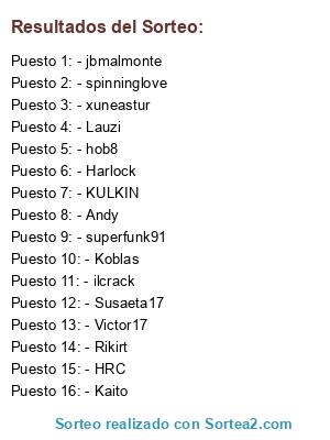 Lista de participantes: - Koblas, - jbmalmonte, - KULKIN, - Lauzi, - Harlock, - Kaito, - Victor17, - Rikirt, - Andy, - spinninglove, - superfunk91, - xuneastur, - Susaeta17, - hob8, - HRC, - ilcrack.