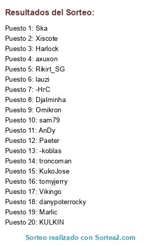 Lista de participantes: Rikirt_SG, Marlic, Paeter, Harlock, KULKIN, lauzi, danypoterrocky, tomyjerry, Djalminha, AnDy, KukoJose, -HrC, troncoman, sam79, -koblas, Xiscote, Ska, axuxon, Omikron, Vikingo.