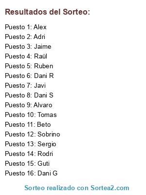 Lista de participantes: Dani G, Dani R, Dani S, Guti, Raül, Alex, Sergio, Alvaro, Tomas, Beto, Rodri, Jaime, Adri, Ruben, Javi, Sobrino.