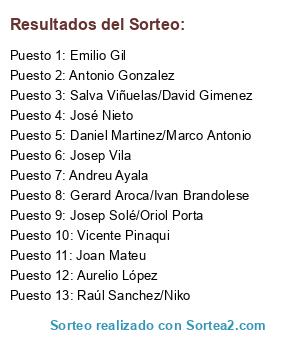 Lista de participantes: Antonio Gonzalez, Salva Viñuelas/David Gimenez, Daniel Martinez/Marco Antonio, Raúl Sanchez/Niko, Vicente Pinaqui, Josep Solé/Oriol Porta, Gerard Aroca/Ivan Brandolese, José Nieto, Josep Vila, Emilio Gil, Joan Mateu, Andreu Ayala, Aurelio López.