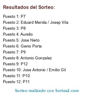 Lista de participantes: Eduard Merida / Josep Vila, Jose Antonio / Emilio Gil, Genis Porta, Jose Nieto, Aurelio, Antonio Gonzalez, P7, P8, P9, P10, P11, P12.