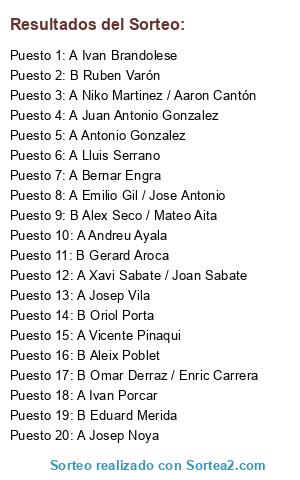 Lista de participantes: B Ruben Varón, A Niko Martinez / Aaron Cantón, A Antonio Gonzalez, B Aleix Poblet, B Gerard Aroca, A Josep Noya, A Ivan Porcar, B Omar Derraz / Enric Carrera, B Alex Seco / Mateo Aita, A Vicente Pinaqui, B Eduard Merida, A Josep Vila, A Lluis Serrano, A Ivan Brandolese, A Emilio Gil / Jose Antonio, B Oriol Porta, A Andreu Ayala, A Bernar Engra, A Xavi Sabate / Joan Sabate, A Juan Antonio Gonzalez.
