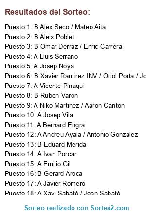 Lista de participantes: B Eduard Merida, A Niko Martinez / Aaron Canton, A Andreu Ayala / Antonio Gonzalez, A Ivan Porcar, A Emilio Gil, B Ruben Varón, A Bernard Engra, B Gerard Aroca, B Omar Derraz / Enric Carrera, B Aleix Poblet, B Alex Seco / Mateo Aita, A Josep Noya, A Josep Vila, A Vicente Pinaqui, B Xavier Ramirez INV / Oriol Porta / Josep Solé, A Lluis Serrano, A Xavi Sabaté / Joan Sabaté, A Javier Romero.
