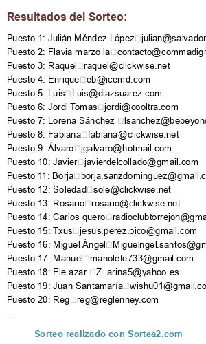 Lista de participantes: @eb, @pvaldes, @clara.manso, @jlrabal, @javier, @juan.garcia.uriol, @Ani_ramos_ani, @sangoca80, @javiercorral, @jordi, @manuelgda, @javierprey, @raulcarrionrincon, @beltranentasmania, @reg, @borja.sanzdominguez, @wishu01, @Miguelngel.santos, @fabirapp01, @jpla, @lsanchez, @Luis, @tiberiuw, @info, @m4mancy, @noelialazaro, @radioclubtorrejon, @contacto, @gonzalo.gep, @mafm10, @julian, @ksenija.matan-jelic, @Comoellegadoaqui, @manolete733, @jl.lobato, @david, @daniel, @Rosamoreno, @aitor, @javierdelcollado, @jesus.perez.pico, @la31miri, @Z_arina5, @elaticoaromatico, @Miguel.jimenez, @raquel, @rosario, @sole, @fabiana, @guille.puig.mate, @juanjose.vaquerizas, @m.alcazar, @jgalvaro, @requeta, @Evagarcia.gs, .