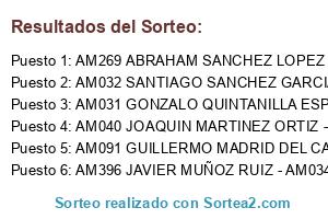 Lista de participantes: AM269 ABRAHAM SANCHEZ LOPEZ - AM056 LUIS FERNANDEZ MONTEAGUDO, AM091 GUILLERMO MADRID DEL CASTILLO - AM092 DAVID MARTINEZ HONRADO, AM031 GONZALO QUINTANILLA ESPARCIA - AM117 CARLOS PEREZ VILLAVERDE, AM032 SANTIAGO SANCHEZ GARCIA - AM211 CESAR MOYA CANO, AM040 JOAQUIN MARTINEZ ORTIZ - AM060 MIGUEL ANGEL LILLO PAREDES, AM396 JAVIER MUÑOZ RUIZ - AM034 JOSE JESUS GALINDO DIAZ.