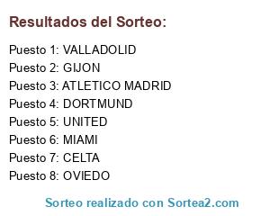 Lista de participantes: CELTA, DORTMUND, OVIEDO, MIAMI, GIJON, UNITED, VALLADOLID, ATLETICO MADRID.