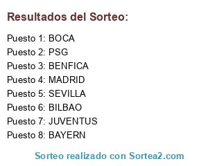 Lista de participantes: BILBAO, MADRID, BAYERN, BOCA, SEVILLA, JUVENTUS, PSG, BENFICA.