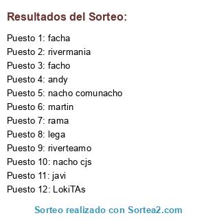Lista de participantes: andy, facha, facho, javi, lega, LokiTAs, martin, nacho cjs, nacho comunacho, rama, rivermania, riverteamo.