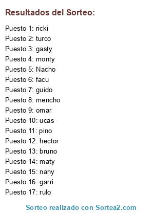 Lista de participantes: nany, turco, ricki, rulo, monty, pino, gasty, facu, Nacho, mencho, omar, guido, bruno, hector, garri, ucas, maty.