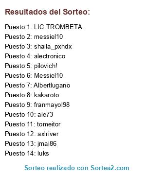 Lista de participantes: Albertlugano, ale73, Messiel10, shaila_pxndx, kakaroto, luks, tomeitor, messiel10, alectronico, pilovich!, jmai86, LIC.TROMBETA, franmayol98, axlriver.