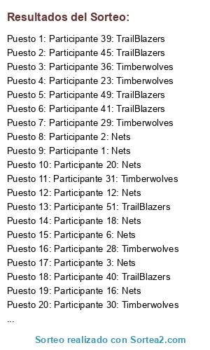 Lista de participantes: Participante 1: Nets, Participante 2: Nets, Participante 3: Nets, Participante 4: Nets, Participante 5: Nets, Participante 6: Nets, Participante 7: Nets, Participante 8: Nets, Participante 9: Nets, Participante 10: Nets, Participante 11: Nets, Participante 12: Nets, Participante 13: Nets, Participante 14: Nets, Participante 15: Nets, Participante 16: Nets, Participante 17: Nets, Participante 18: Nets, Participante 19: Nets, Participante 20: Nets, Participante 21: Timberwolves, Participante 22: Timberwolves, Participante 23: Timberwolves, Participante 24: Timberwolves, Participante 25: Timberwolves, Participante 26: Timberwolves, Participante 27: Timberwolves, Participante 28: Timberwolves, Participante 29: Timberwolves, Participante 30: Timberwolves, Participante 31: Timberwolves, Participante 32: Timberwolves, Participante 33: Timberwolves, Participante 34: Timberwolves, Participante 35: Timberwolves, Participante 36: Timberwolves, Participante 37: Timberwolves, Participante 38: Timberwolves, Participante 39: TrailBlazers, Participante 40: TrailBlazers, Participante 41: TrailBlazers, Participante 42: TrailBlazers, Participante 43: TrailBlazers, Participante 44: TrailBlazers, Participante 45: TrailBlazers, Participante 46: TrailBlazers, Participante 47: TrailBlazers, Participante 48: TrailBlazers, Participante 49: TrailBlazers, Participante 50: TrailBlazers, Participante 51: TrailBlazers, Participante 52: TrailBlazers.