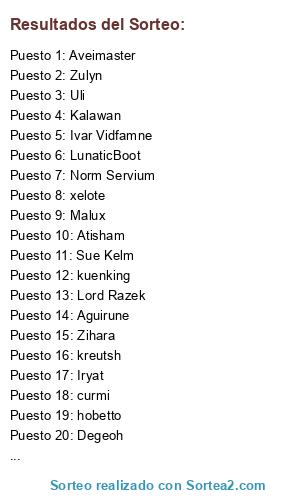 Lista de participantes: Norm Servium, Warlas, Atisham, Zuuk, Malux, Erik, Shanhiran, LunaticBoot, Degeoh, Aguirune, Eldunar, curmi, Elodie, thedanjovi, Sillonmaste, Zarzas, hobetto, JANIS, Kalawan, Nebura, S bob, queen of ilusion, Marduk bronk, Nuun, kamarada, Zulyn, Many munz, Lord Razek, Sue Kelm, Aveimaster, Arkangel Retornado, Painy deaths, Uli, Ivar Vidfamne, thankol, Iryat, Tei xu, sooki, viernes Venusiano, xelote, arkangel Dranosh, Arkangel Nestle, arkangel deditus, kreutsh, estereotipo, marcopollo, dadest, kuenking, reika Breeze, tapabo, rein storm, arkangel aniureth, Darkziracles, Arkangel hades, dynaheir Stornborn, Zihara.