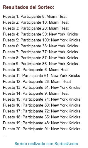 Lista de participantes: Participante 1: Miami Heat, Participante 2: Miami Heat, Participante 3: Miami Heat, Participante 4: Miami Heat, Participante 5: Miami Heat, Participante 6: Miami Heat, Participante 7: Miami Heat, Participante 8: Miami Heat, Participante 9: Miami Heat, Participante 10: Miami Heat, Participante 11: Miami Heat, Participante 12: Miami Heat, Participante 13: Miami Heat, Participante 14: Miami Heat, Participante 15: Miami Heat, Participante 16: Miami Heat, Participante 17: Miami Heat, Participante 18: Miami Heat, Participante 19: Miami Heat, Participante 20: Miami Heat, Participante 21: Miami Heat, Participante 22: Miami Heat, Participante 23: Miami Heat, Participante 24: Miami Heat, Participante 25: Miami Heat, Participante 26: Miami Heat, Participante 27: Miami Heat, Participante 28: Miami Heat, Participante 29: Miami Heat, Participante 30: Miami Heat, Participante 31: Miami Heat, Participante 32: Miami Heat, Participante 33: New York Knicks, Participante 34: New York Knicks, Participante 35: New York Knicks, Participante 36: New York Knicks, Participante 37: New York Knicks, Participante 38: New York Knicks, Participante 39: New York Knicks, Participante 40: New York Knicks, Participante 41: New York Knicks, Participante 42: New York Knicks, Participante 43: New York Knicks, Participante 44: New York Knicks, Participante 45: New York Knicks, Participante 46: New York Knicks, Participante 47: New York Knicks, Participante 48: New York Knicks, Participante 49: New York Knicks, Participante 50: New York Knicks, Participante 51: New York Knicks, Participante 52: New York Knicks, Participante 53: New York Knicks, Participante 54: New York Knicks, Participante 55: New York Knicks, Participante 56: New York Knicks, Participante 57: New York Knicks, Participante 58: New York Knicks, Participante 59: New York Knicks, Participante 60: New York Knicks, Participante 61: New York Knicks, Participante 62: New York Knicks, Participante 63: New York Knicks, Participante 64: New York Knicks, Participante 65: New York Knicks, Participante 66: New York Knicks, Participante 67: New York Knicks, Participante 68: New York Knicks, Participante 69: New York Knicks, Participante 70: New York Knicks, Participante 71: New York Knicks, Participante 72: New York Knicks, Participante 73: New York Knicks, Participante 74: New York Knicks, Participante 75: New York Knicks, Participante 76: New York Knicks, Participante 77: New York Knicks, Participante 78: New York Knicks, Participante 79: New York Knicks, Participante 80: New York Knicks, Participante 81: New York Knicks, Participante 82: New York Knicks, Participante 83: New York Knicks, Participante 84: New York Knicks, Participante 85: New York Knicks, Participante 86: New York Knicks, Participante 87: New York Knicks, Participante 88: New York Knicks, Participante 89: New York Knicks, Participante 90: New York Knicks, Participante 91: New York Knicks, Participante 92: New York Knicks, Participante 93: New York Knicks, Participante 94: New York Knicks, Participante 95: New York Knicks, Participante 96: New York Knicks, Participante 97: New York Knicks, Participante 98: New York Knicks, Participante 99: New York Knicks, Participante 100: New York Knicks.
