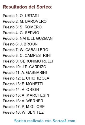 Lista de participantes: G. SERVIO, O. USTARI, P. MIGLIORE, J. BROUN, GERONIMO RULLI, L. CHICHIZOLA, A. MARCHESIN, S. ROMERO, W. CABALLERO, NAHUEL GUZMAN, J.P. CARRIZO, M. BAROVERO, C. CAMPESTRINI, F. MONETTI, A. ORION, A. GABBARINI, W. BENITEZ, A. WERNER.