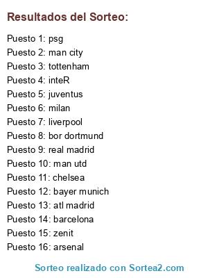 Lista de participantes: atl madrid, barcelona, real madrid, milan, inteR, juventus, tottenham, man utd, man city, liverpool, arsenal, chelsea, zenit, bor dortmund, bayer munich, psg.