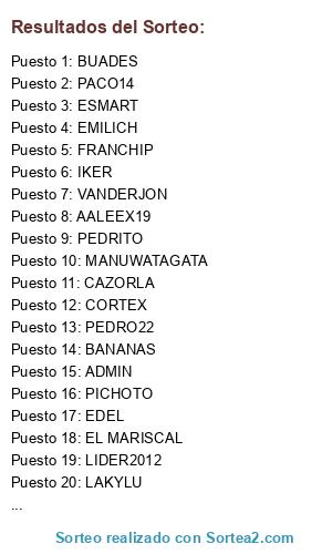 Lista de participantes: BANANAS, LAKYLU, PICHOTO, CAZORLA, CORTEX, THEALEY, IKER, FRANCHIP, PEDRO22, BRASILEÑO, PACO14, ADMIN, VANDERJON, ESMART, LIDER2012, MANUWATAGATA, EL MARISCAL, BUADES, AALEEX19, TRIANA, GOLFO, EDEL, EMILICH, PEDRITO.