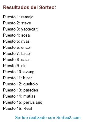 Lista de participantes: sosa, queirolo, falco, matias, eli, steve, ramajo, paredes, salas, hiper, azang, pertusiano, rivas, enzo, yaotecalt, Real.