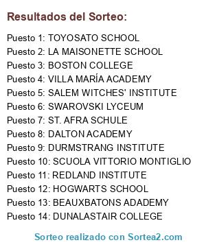 Lista de participantes: DUNALASTAIR COLLEGE, HOGWARTS SCHOOL, BEAUXBATONS ADADEMY, DURMSTRANG INSTITUTE, VILLA MARÍA ACADEMY, BOSTON COLLEGE, LA MAISONETTE SCHOOL, REDLAND INSTITUTE, SCUOLA VITTORIO MONTIGLIO, SALEM WITCHES' INSTITUTE, SWAROVSKI LYCEUM, TOYOSATO SCHOOL, ST. AFRA SCHULE, DALTON ACADEMY.