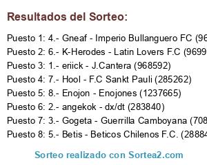 Lista de participantes: 1.- eriick - J.Cantera (968592), 2.- angekok - dx/dt (283840), 3.- Gogeta - Guerrilla Camboyana (708996), 4.- Gneaf - Imperio Bullanguero FC (969529), 5.- Betis - Beticos Chilenos F.C. (288844), 6.- K-Herodes - Latin Lovers F.C (969967), 7.- Hool - F.C Sankt Pauli (285262), 8.- Enojon - Enojones (1237665).