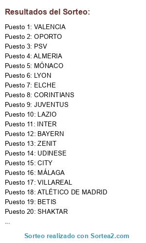 Lista de participantes: BARÇA, REAL MADRID, MANCHESTE UNITED, ATLÉTICO DE MADRID, VALENCIA, INTER, MÁLAGA, BETIS, AJAX, BAYERN, LAZIO, CORINTIANS, ALMERIA, SHAKTAR, BOCA, LYON, ZENIT, VILLAREAL, OPORTO, JUVENTUS, UDINESE, PSV, MÓNACO, CELTA, ELCHE, CITY.