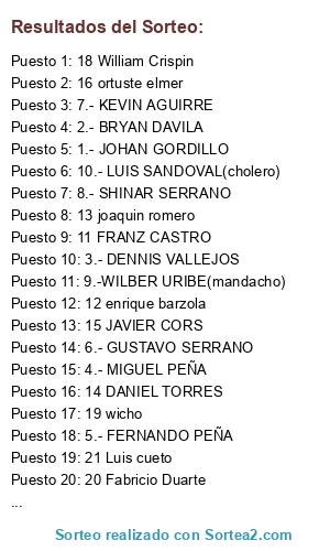 Lista de participantes: 1.- JOHAN GORDILLO, 2.- BRYAN DAVILA, 3.- DENNIS VALLEJOS, 4.- MIGUEL PEÑA, 5.- FERNANDO PEÑA, 6.- GUSTAVO SERRANO, 7.- KEVIN AGUIRRE, 8.- SHINAR SERRANO, 9.-WILBER URIBE(mandacho), 10.- LUIS SANDOVAL(cholero), 11 FRANZ CASTRO, 12 enrique barzola, 13 joaquin romero, 14 DANIEL TORRES, 15 JAVIER CORS, 16 ortuste elmer, 17 Mariano Méndez Roca O., 18 William Crispin, 19 wicho, 20 Fabricio Duarte, 21 Luis cueto.