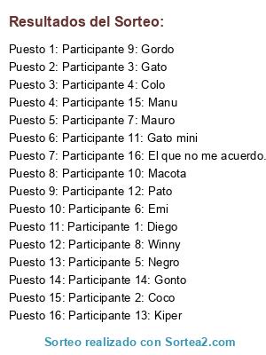 Lista de participantes: Participante 1: Diego, Participante 2: Coco, Participante 3: Gato, Participante 4: Colo, Participante 5: Negro, Participante 6: Emi, Participante 7: Mauro, Participante 8: Winny, Participante 9: Gordo, Participante 10: Macota, Participante 11: Gato mini, Participante 12: Pato, Participante 13: Kiper, Participante 14: Gonto, Participante 15: Manu, Participante 16: El que no me acuerdo..