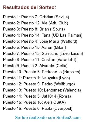 Lista de participantes: Puesto 1: Nauyaira (Lyon), Puesto 2: Alvarete (Celta), Puesto 3: Jaf1014 (Roma), Puesto 4: Jose Maria (Watford), Puesto 5: Pedroncillo (Napoles), Puesto 6: Pablo (Liverpool), Puesto 7: Cristian (Sevilla), Puesto 8: Brian ( Spurs), Puesto 9: Pedro (Wolfburgo), Puesto 10: Lentomez (Valencia), Puesto 11: Cristian (Valladolid), Puesto 12: Ale (Ath. Club), Puesto 13: Serrucho (Leverkusen), Puesto 14: Tana (UD Las Palmas), Puesto 15: Aaron (Milan), Puesto 16: Ale ( CSKA).