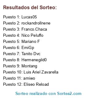 Lista de participantes: Franco.Chaca, rockandrollnene, Lucas05, Hermenegild0, amiwo, Nico Peluffo, Tanito Dvc, Mariano F, Eliseo Reload, Luis Ariel Zavarella, Montang, EmiGp.