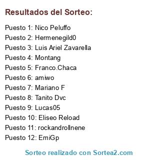 Lista de participantes: Franco.Chaca, rockandrollnene, Lucas05, Hermenegild0, amiwo, Nico Peluffo, Tanito Dvc, Mariano F, Eliseo Reload, Luis Ariel Zavarella, Montang, EmiGp.