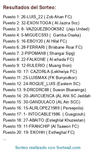 Lista de participantes: 1- INTOCABLE1986 ( Guagzouh), 2-PIPOMAN8 ( Shangai Sipg), 3-FISTA_88 ( Seoul), 4-PACOESTE ( Ulsan hyundai), 5-MIGUECS93 ( Gamba Osaka), 6-DJ_LUIAN (W.sidney Wanderers), 7-MANDANGA86 (Kashima Antlers), 8- VAZQUEZBOOKS82 (Jeju United), 9-DRCDRC88 ( Suwon Bluewings), 10-VALLE_17 ( Jiangsung Suning), 11-FRANCHIP (Al Taawon FC), 12-RULERIO ( Muang thon), 13-AGUDM (Adelaide United), 14-XAVIRE1234 (Kawasaki Frontale), 15-ALRLOPEZ1989 ( Persepolis), 16-EBOY20 ( Al Hilal FC), 17- CAZORLA (Lekhwiya FC), 18- BELLOTO 40( Urawa red deamonds), 19- EKOHH ( Estheghal FC), 20-JAVICUENCA (AL Ahli SC Jeddah ), 21-FABIANORZ ( Al Rayyan SC), 22-FALKONE ( Al whada FC), 23-ROCKERO (Lokomotiv Tashkent), 24-ROQUE_LUIS (Eastern SC), 25-LUISMAX (FK Bunyodkor), 26-LUIS_22 ( Zob Ahan FC), 27-ABAITO (Esteghlal Khuzestan), 28-FERRARI ( Brisbane Roar FC), 29-RG1456 ( AL Fateh SC), 30-GANDULACO (AL Ain SCC), 31-ECUADECORA (Al Ahli FC Dubai), 32-EXON TOGA ( Al Jazira Scc).
