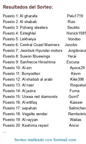 Lista de participantes: Central Coast Mariners Jacobo, Guizhou renhe Luis22, Esteghlal Nonick1981, sepahan Selinichev, Vegalta sendai Rambototal, Urawa red diamonds Gorri7, Kashima reysol Ancor, Sanfrecce Hiroshima Escuna, Al gharafa Pelu1719, Al rayyan Waitas, Lekhwiya Voodoo, Al ahli Javivale, Al ettifaq Kaisser, Al hilall Rafuka, Al shabab Rizo, Fc seoul Jacob90, Jeonbuk Hyundai motors Jorgitoceuta, Pohang steelers Seutito, Suwon Bluewings Yerai, Al ain Ayoce29, Al jazira Fuma, Al nasr Roqueluis, Al shabab al arabi Kike398, Bunyodkor Kevin.