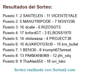 Lista de participantes: 9 TheAlex650 - 18 ovi_loko, 14 vitolawasa - 4 PROJECT38, 10 ALVAROYGSUS - 15 brs_bullet, 13 PAKMAN6969 - 12 jifri_cdq, 2 SANTELEN - 11 VICENTEYALE, 5 MANUTRIPODE - 7 NONY206, 1 BENI30 - 8 triumph675street, 16 dcalle - 6 RIZOSGT5, 17 lorfordGT - 3 ELBOSS1970.