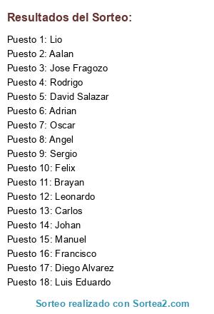 Lista de participantes: Aalan, Rodrigo, Diego Alvarez, Luis Eduardo, Adrian, Brayan, Lio, Angel, Oscar, Jose Fragozo, Francisco, Leonardo, Felix, Sergio, Manuel, Johan, Carlos, David Salazar.