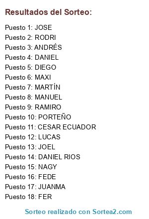 Lista de participantes: MAXI, FEDE, RODRI, NAGY, ANDRÉS, RAMIRO, DIEGO, MARTÍN, CESAR ECUADOR, MANUEL, JOSE, LUCAS, PORTEÑO, JOEL, DANIEL, JUANMA, FER, DANIEL RIOS.
