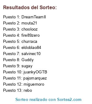Lista de participantes: Guddy, fire89zero, DreamTeamII, salvinec10, pajomarquez, mouta21, sugay, rebo, churraca, miguemoro, choolooz, juankyOGTB, eldoblao84.