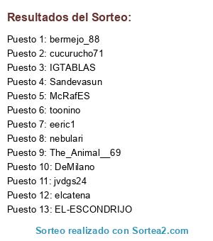 Lista de participantes: The_Animal__69, jvdgs24, IGTABLAS, elcatena, McRafES, EL-ESCONDRIJO, Sandevasun, nebulari, bermejo_88, DeMilano, toonino, cucurucho71, eeric1.