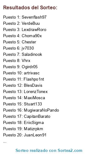 Lista de participantes: lecsmaster, Matizrpkm, gastonagustin, JotaZ24, LexdrawRoro, MugiwaraNoPando, Saladinook, Choma90x, CapitanBarato, Turn1e, Stuart133, Ogirdr05, EriicSigma, LorenzTonex, artrivasc, Flashpo1nt, Sevenflash97, BBTPrado, Chester, VerdeBuu, BlesDavis, joyemeok, MaxiMosca, jv7030, Blackdogus, JuanLeon91, Vhrx.