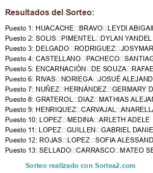 Lista de participantes: LOPEZ MEDINA ARLETH ADELE, SOLIS PIMENTEL DYLAN YANDEL, CASTELLANO PACHECO SANTIAGO JOSÉ, RIVAS NORIEGA JOSUÉ ALEJANDRO, HENRIQUEZ CARVAJAL ANARELLA SOPHIA, SELLADO CARRASCO MATEO SEBASTIAN, GRATEROL DIAZ MATHIAS ALEJANDRO, DELGADO RODRIGUEZ JOSYMAR SOFIA, ENCARNACIÓN DE SOUZA RAFAELLA DAMILETH LEIA, ROJAS LOPEZ SOFIA ALESSANDRA, HUACACHE BRAVO LEYDI ABIGAIL, LOPEZ GUILLEN GABRIEL DANIEL, NUÑEZ HERNÁNDEZ GERMARY DEL VALLE, HUAMAN ALIAGA ANA LUCIA.