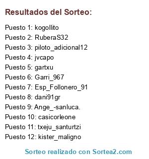 Lista de participantes: kogollito, kister_maligno, jvcapo, casicorleone, gartxu, txeju_santurtzi, dani91gr, Esp_Follonero_91, Ange_-sanluca., Garri_967, RuberaS32, piloto_adicional12.