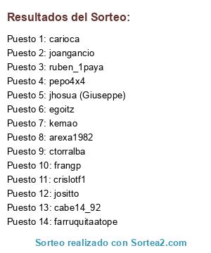 Lista de participantes: cabe14_92, kemao, crislotf1, frangp, jositto, carioca, pepo4x4, joangancio, ruben_1paya, arexa1982, ctorralba, egoitz, jhosua (Giuseppe), farruquitaatope.