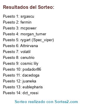 Lista de participantes: morgan_turner, juaneka, cenutrio, fermin, volatil, dacedoga, Attnirvana, cosmic lily, srgascu, podador86, eublepharis, mcpower, rygart (Spec_viper), dct_rossi.