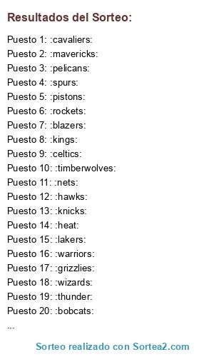 Lista de participantes: :blazers:, :bobcats:, :bulls:, :cavaliers:, :celtics:, :clippers:, :grizzlies:, :hawks:, :heat:, :pelicans:, :kings:, :knicks:, :lakers:, :mavericks:, :nets:, :nuggets:, :pacers:, :timberwolves:, :thunder:, :suns:, :spurs:, :rockets:, :raptors:, :warriors:, :wizards:, :pistons:.